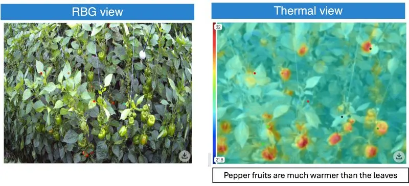 In practice, what we see with pepper growers is a shift toward vision-based monitoring. Using the Sigrow Stomata Camera (AI-powered thermal imaging), growers can automatically detect and distinguish fruits and leaves, and measure their temperatures in real time and couple it to the climate computer and steer directly via Priva Horticulture, Hoogendoorn Growth Management and Ridder
